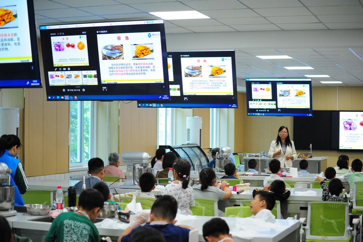 实践体验环节,“红粮麦田”品牌的育人特色尽显。党支部特别邀请烟台大学彭新颜教授开展食品营养科普讲座,彭教授用通俗易懂的语言讲解常见食物的营养成分,以及如何进行合理膳食搭配等实用知识,引导孩子们从营养角度重视食物的价值。山东商务职业学院于海洋副教授则带领孩子们分组参与“我是科学烘焙小能手”实践课——称量面粉、调配食材,制作降糖馒头、烘焙点心,手把手教大家掌握制作技巧。当孩子们捧着自己亲手做的营养美食时,不仅收获了成就感,更在实践中践行了“红粮麦田”“知行合一护粮安”的理念。