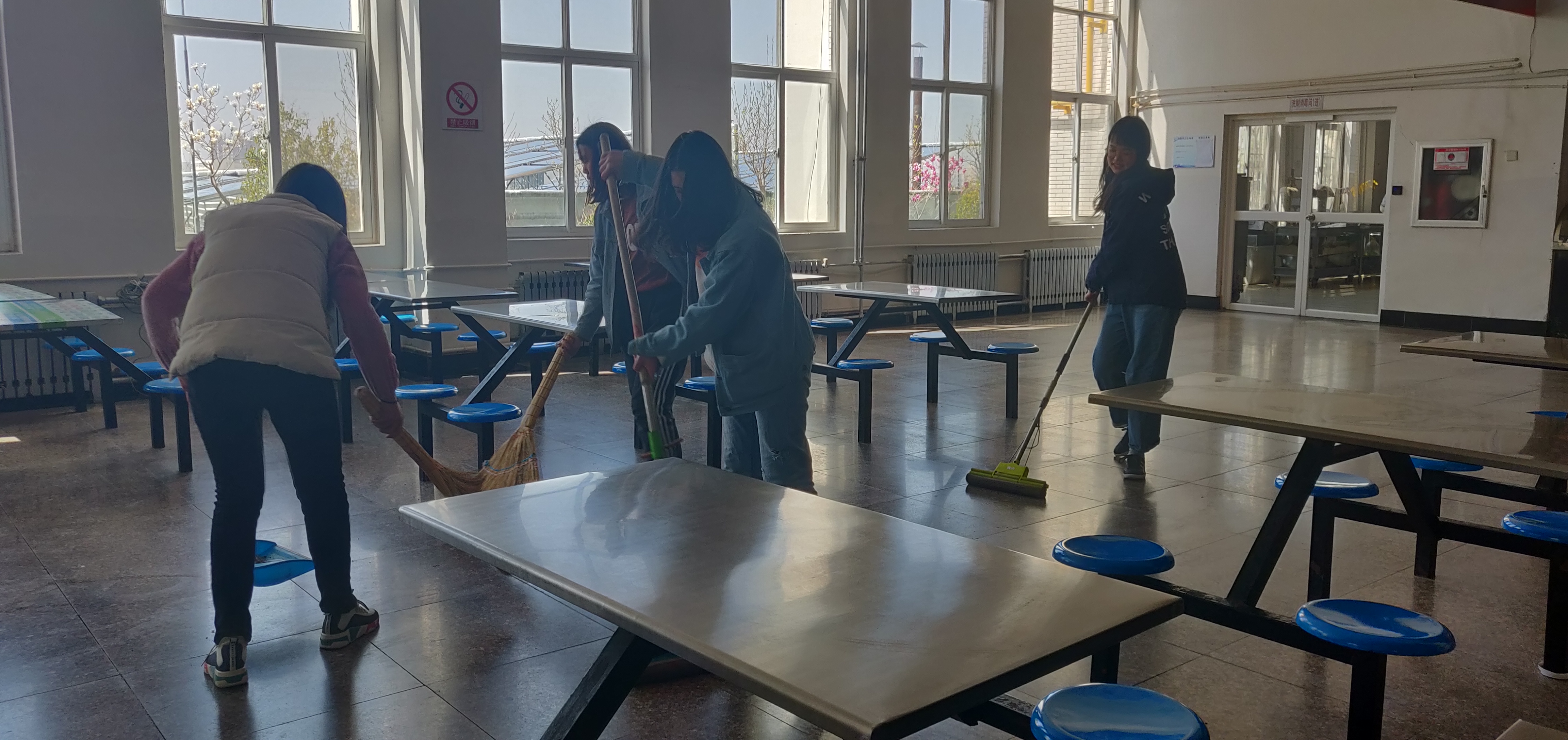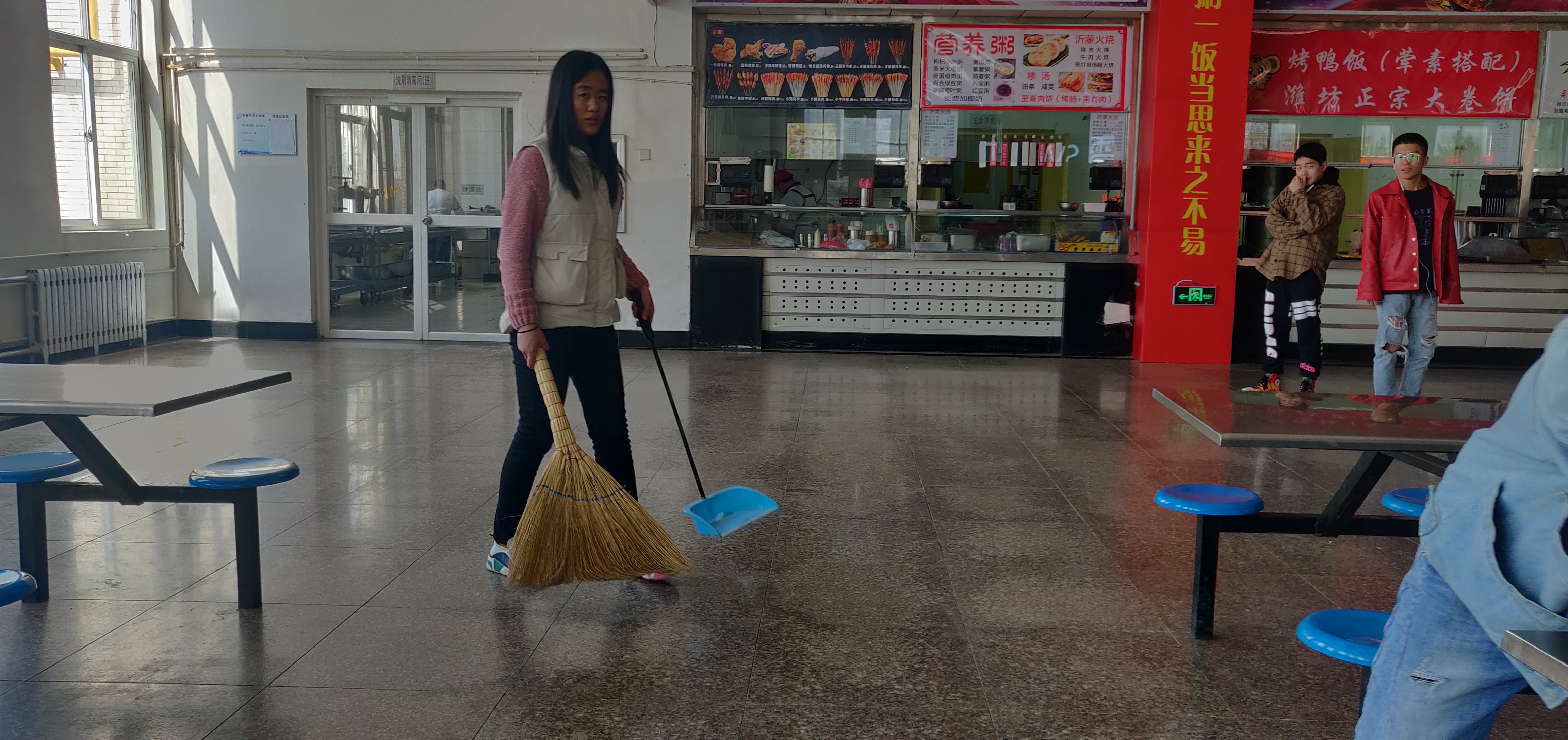 参加活动的同学们1点准时到餐厅集合,负责人员分配好任务后,同学们就积极投入活动中。有的擦桌子,有的擦玻璃,还有的扫地,同学们做事认真负责,互帮互助,充分的体验到了集体力量的强大,不一会儿就把餐厅打扫完了。在活动中他们充分发扬了不怕苦不怕累的精神,并且每个人都体验到活动的乐趣。