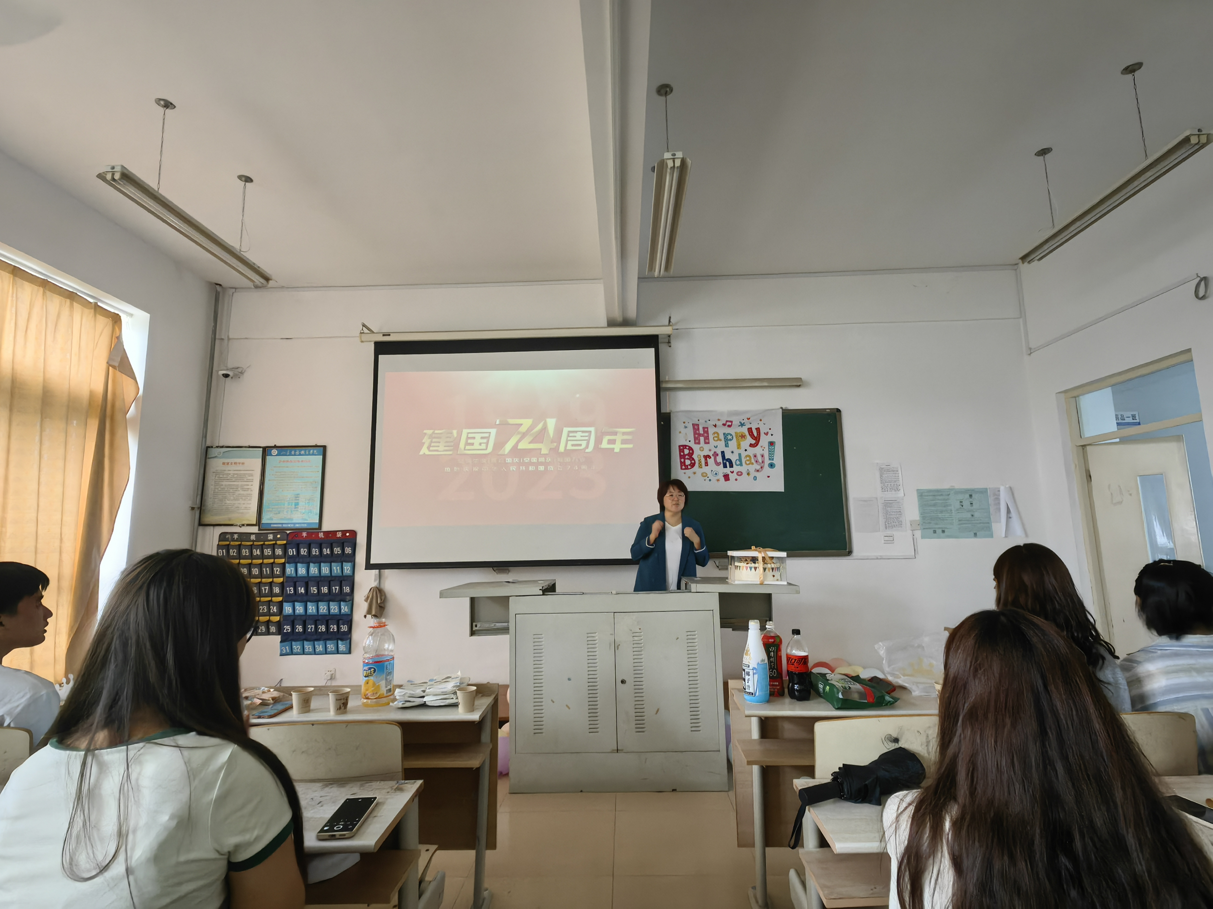同学们一起吹气球,挂彩旗,布置会场,忙得不亦乐乎。大家一起分切月饼,分享美食,良好氛围增加了同学们的班级认同感。气氛在分享蛋糕环节达到高潮,同学们18年华,正值青春,朝气蓬勃,伟大祖国74周年华诞,砥砺奋进,繁荣昌盛!在生日快乐歌中,“寿星”们一起许下自身成长和祝福祖国的美好愿望。