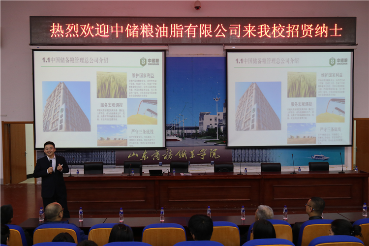 为了向同学们提供大量优秀岗位,帮助同学们累积社会经验,食品工程系携手机电工程系、经济管理系诚挚邀请中储粮油脂有限公司于10月13日上午8:30在图书馆二楼报告厅举行了“中储粮招贤纳士专场招聘会”食品工程系王德学书记、王道波主任、熊素敏老师、任秀娟老师、田晓花老师、曲小萌老师以及机电工程系董学臣老师出席了本次宣讲会。会议由我校2007级毕业生、中储粮油脂有限公司人力资源部主管陈泽进行讲解。