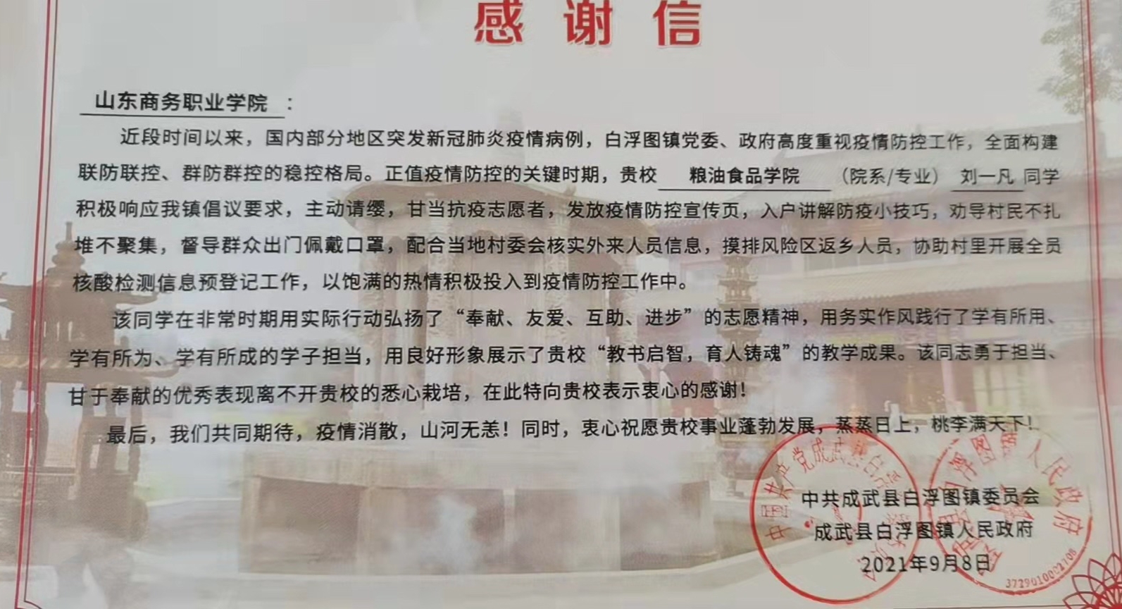 2021年12月,粮油食品学院收到一封来自菏泽市白浮图镇党委、政府的感谢信,信中对于粮油食品学院学子刘一凡同学主动请缨,甘当抗疫志愿者进行了表扬,并对学校给予感谢。