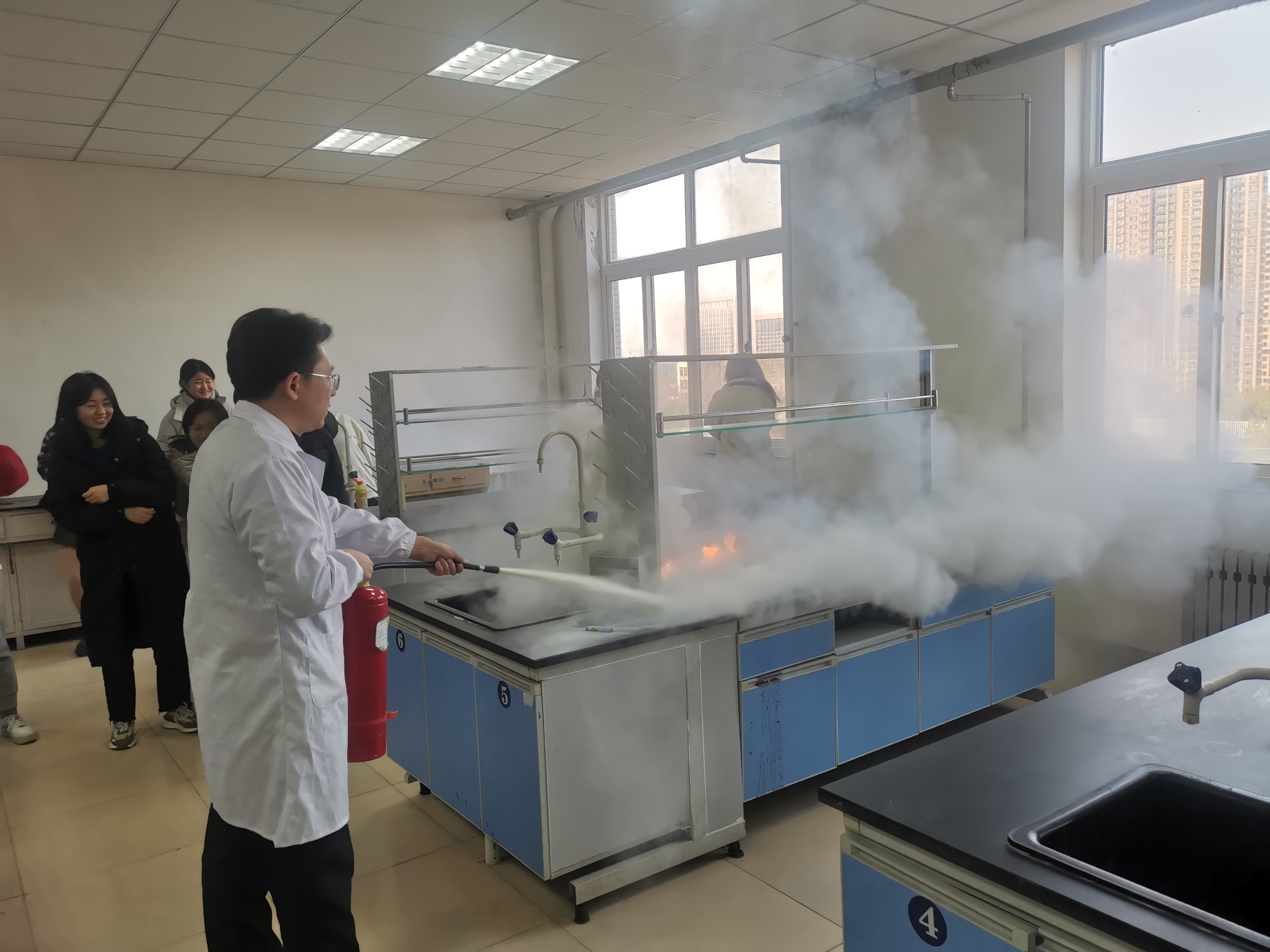 此次活动由实验室主任赵强培训,分别从紧急火情、危化品扩散、触电休克三个方面进行应急演练。紧急火情应急演练中讲解了消防安全常识、火灾预防措施、灭火器的使用方法,实地示范了灭火器的使用及扑救火灾的消防演练;危化品扩散应急演练中通过情境模拟,引导学生从东西两侧疏散通道撤离,切断电源,关闭扩散点前后门,正确打开窗、通风系统做到有效通风;触电休克应急演练中通过模拟学生触电,主要从正确断电、紧急心肺复苏和等待120救援三个方面进行演练。赵强老师培训中声情并茂,突出重点,为参加演练的师生上了一堂生动的安全课。