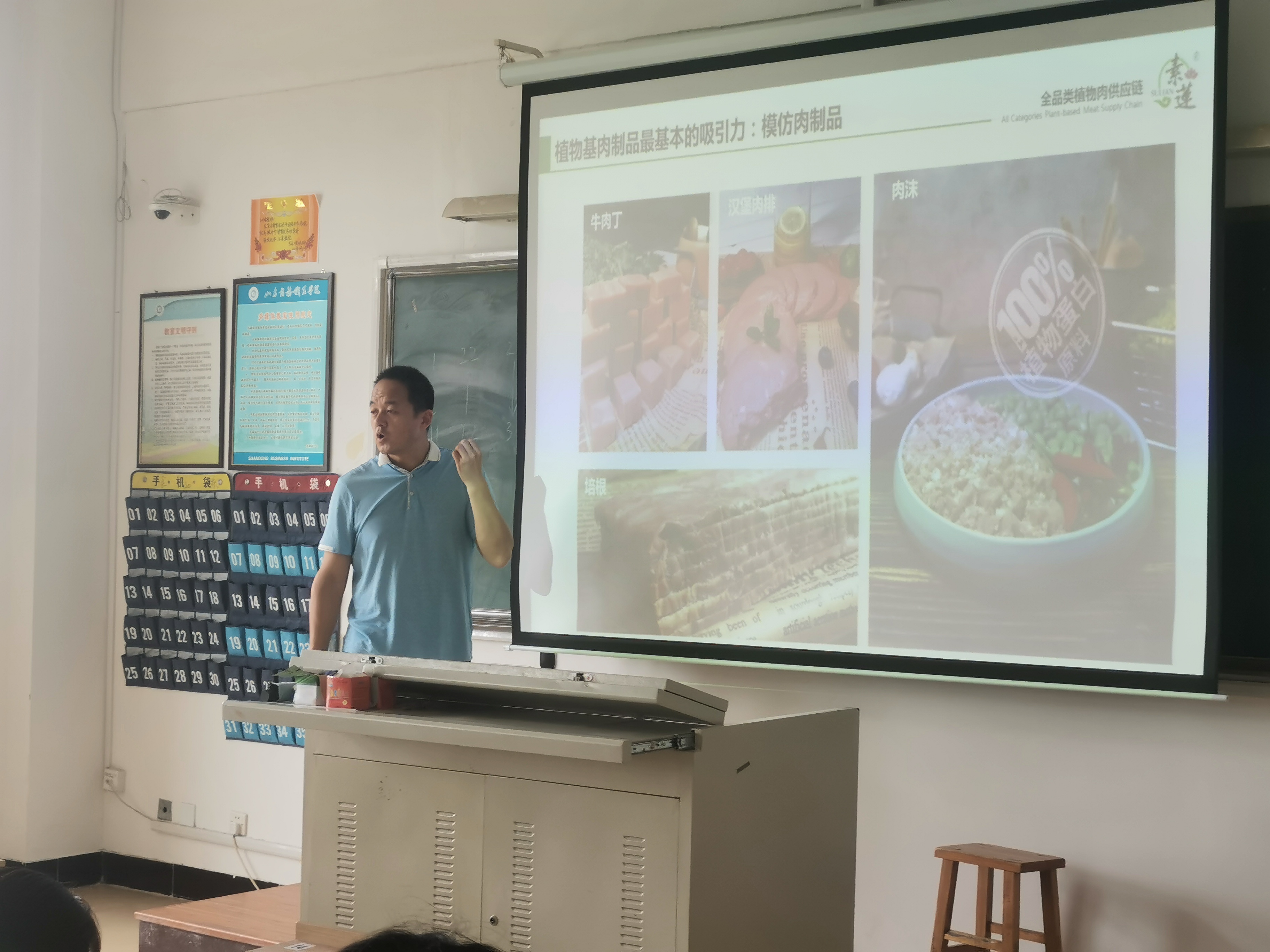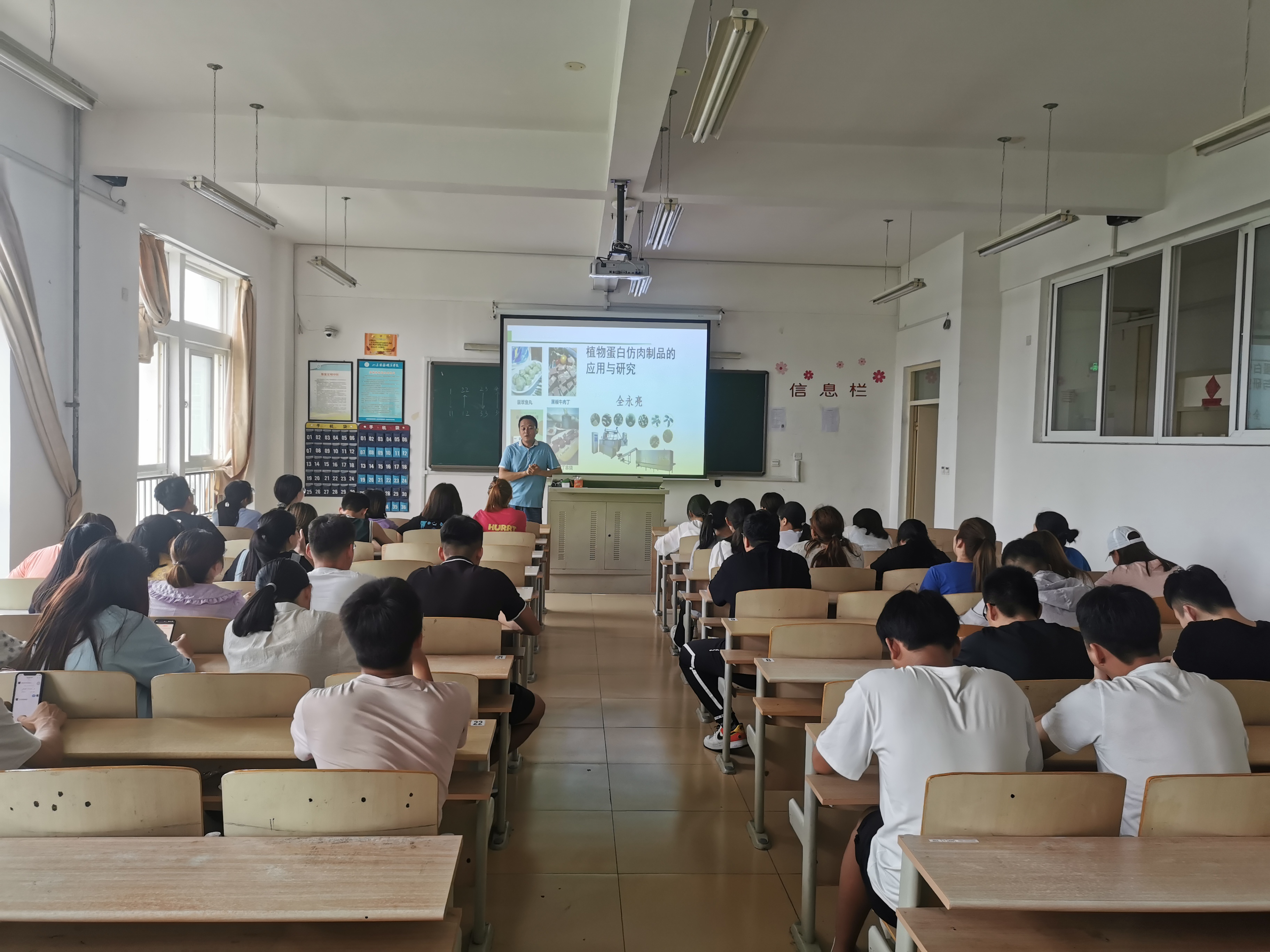 以《植物蛋白仿肉制品成型关键技术与应用》为题目,全永亮老师从研究现状、仿肉制品成型技术、研究进展和研究成果四方面开展讲解。结合植物蛋白仿肉制品的起源,和市场发展趋势等,全老师对蛋白仿肉制品进行了整体介绍,以大豆蛋白、花生蛋白、马铃薯蛋白等为代表的原料生产出的蛋白仿肉制品,在环境友好、资源节约和营养健康方面表现出了更加明显的优势,再从当前研究的方向,研究热点,粮油企业的产品,改进加工工艺和技术,以提高植物肉的品质等方面进行了深入浅出的讲解,结合同学们食品常识和粮食专业知识,言语通俗易懂,形象生动,讲座的内容即实用又深刻,倍受同学们的欢迎。