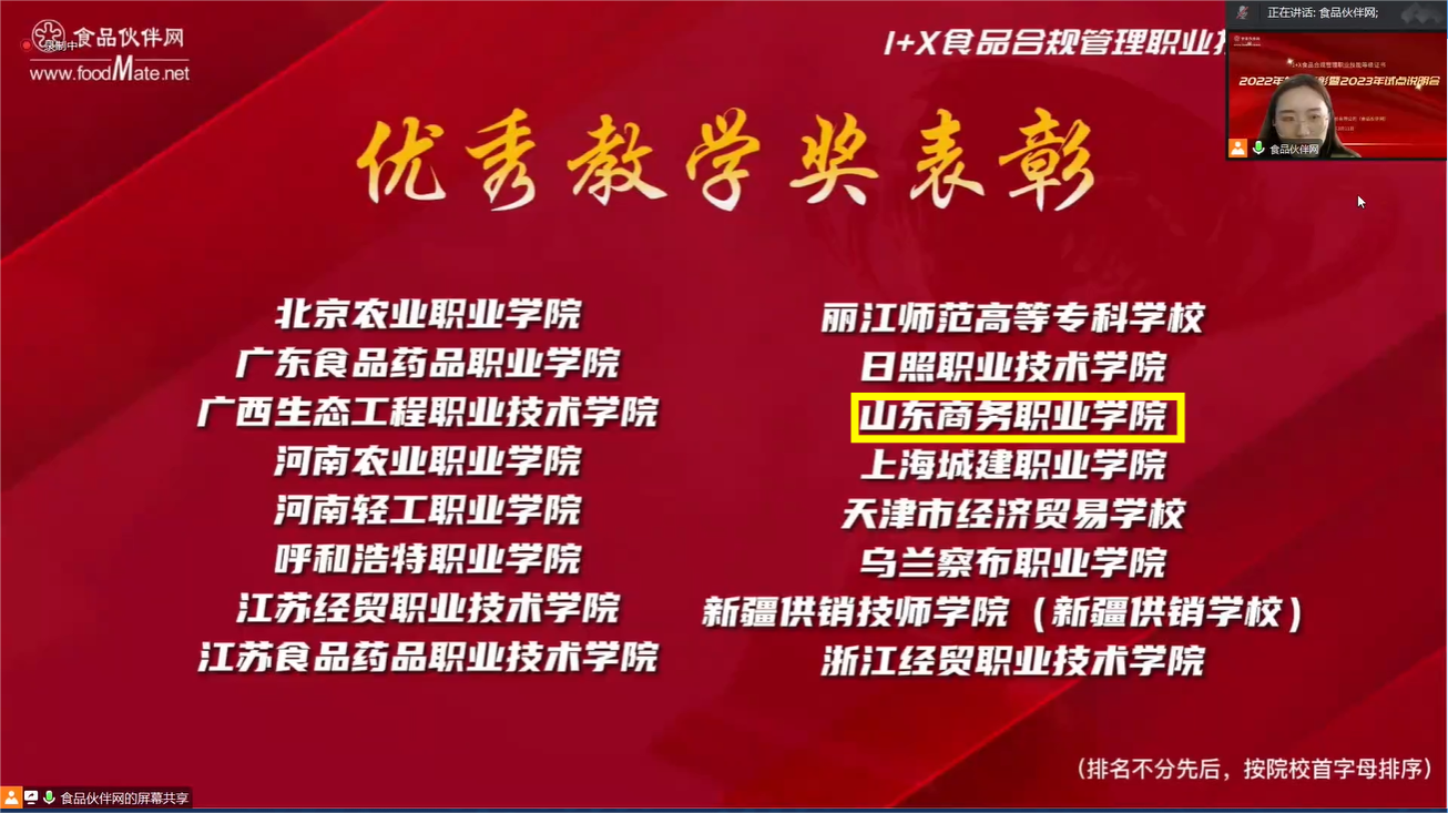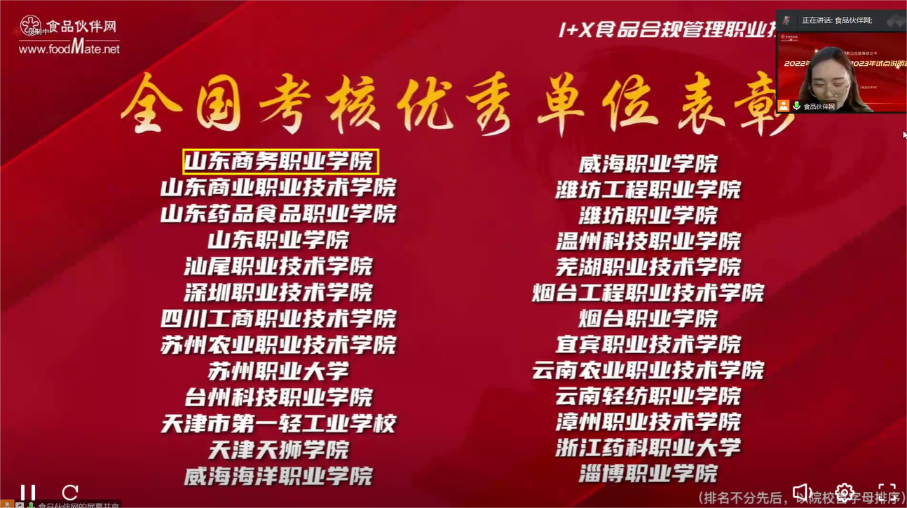 近日,在2022年度1+X食品合规管理职业技能等级证书工作总结表彰会上,我校荣获“优秀教学奖”和“全国考核优秀单位”,这已是我校连续第两年获颁这两个奖项。