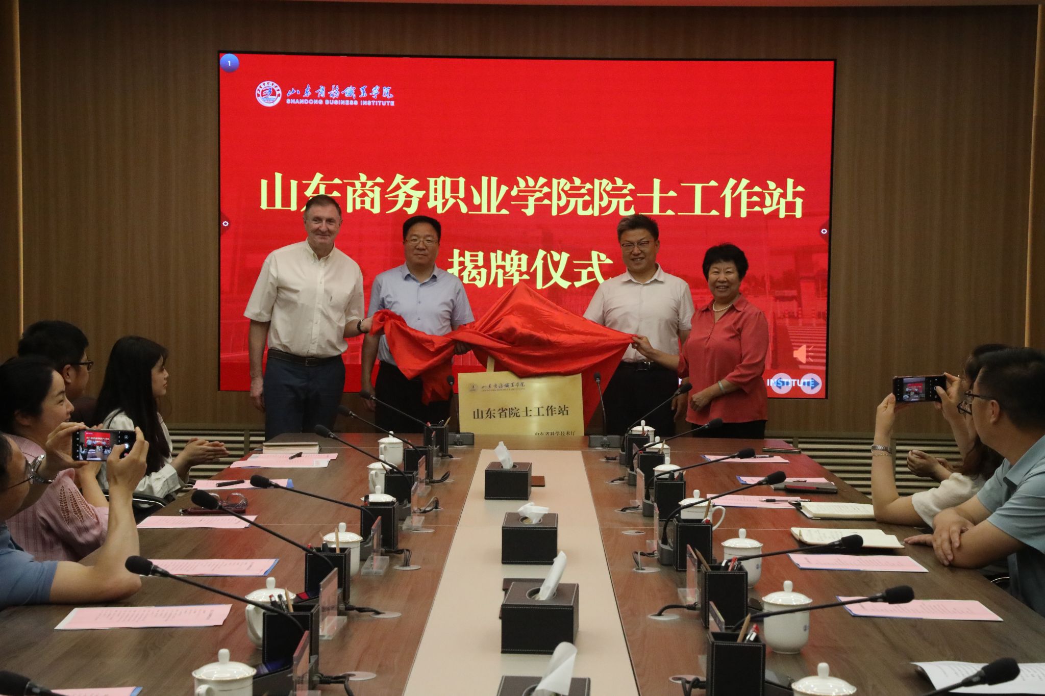 在与会嘉宾见证下,彼得罗夫院士、齐照良副局长、山东华思生物科技有限公司董事长孔祥梅与张越副书记共同为“山东商务职业学院院士工作站”揭牌,标志着学校在高端科研平台建设与国际化产学研融合领域迈出关键一步。